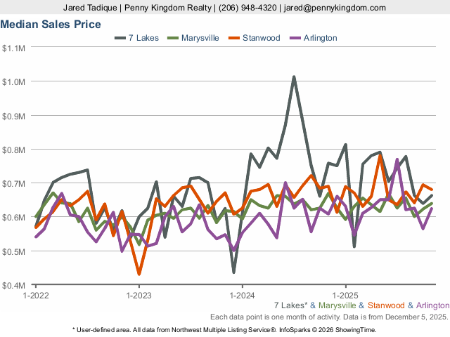 Marysville remains one of the most stable markets in the region. The November 2025 median price landed at $639,000, continuing a steady upward trend after the dip earlier in 2025. While price swings haven’t been as dramatic as some neighboring areas, consistent buyer demand is keeping values supported moving into the end of the year.
