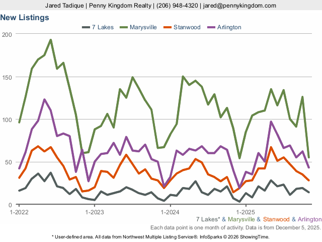 The number of new listings reflects the fresh inventory entering the market. This is an important factor for both buyers and sellers. Here’s how new listings in 7 Lakes, Marysville, Stanwood, and Arlington have shifted over the past three years: