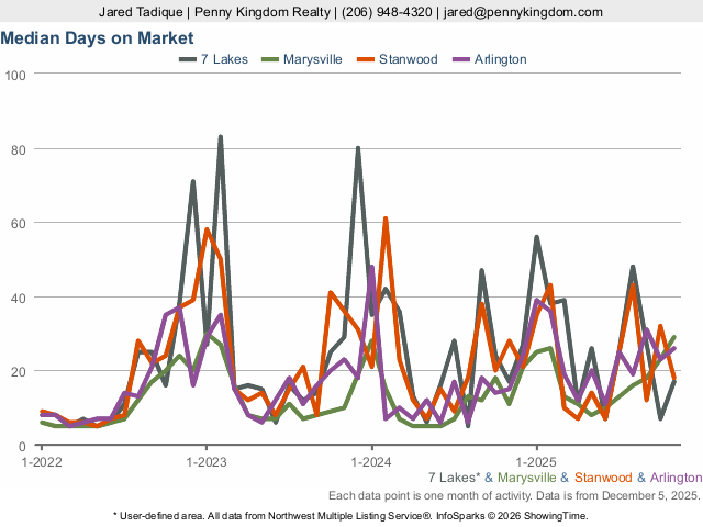 Stanwood saw homes averaging 18 days on market in November, a notable drop from 32 days in October. This improvement points to stronger buyer engagement compared to the previous month, despite reduced seasonal inventory.