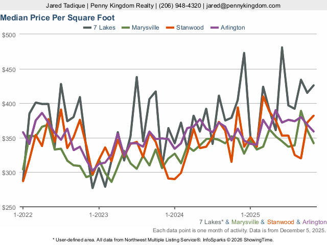 Stanwood recorded $382 per square foot in November, a notable increase from $372 in October. This uptick points to renewed buyer willingness to pay for updated and move-in-ready homes, especially in desirable pockets of the market.